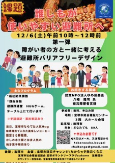 『宝塚 防災チャレンジ/併設 たからっ子防災くらぶ』の設立に至ったのは、昨年の12月~今年の3月末にかけてだそうです。宝塚市ボランタリープラザ zukavo さんの社協ギャラリーの場所を拝借し、ワークショップ 3 回行い内容の展示と、宝塚消防署の御協力を得て展示活動を行ないました。 幸いにも好評なお声をいただけたそうです。 内容は「阪神淡路大震災30年」ということと、東日本大震災14年までテーマ性を繋げ、それらにふさわしい内容での開催をきっかけに今年の 4 月に当会の立ち上げとなりました。 今年の夏には、「防災食」とテーマにし、お子さんと実践ある防災食の有り方など、宝塚市中央公民館さんと共催開催の開催とは別に、所在地が売布の第一地区本部さんの会場をお借りし、そちらでもサマーイベントを行われました。 今回は、12月6日?に『誰しもが過ごしやすい避難所へ~障がい者と一緒に考える避難所バリアフリーデザイン』と題して、場所は宝塚市総合福祉センターの 3 階大ホールにて開催いたします。 ちょうど現在申し込みを受け付けている真っ最中で、締め切りは11月30日です。 是非、お越しください。 避難所は現在、どのような事が課題として取り上げられているのかお教えて頂きました。