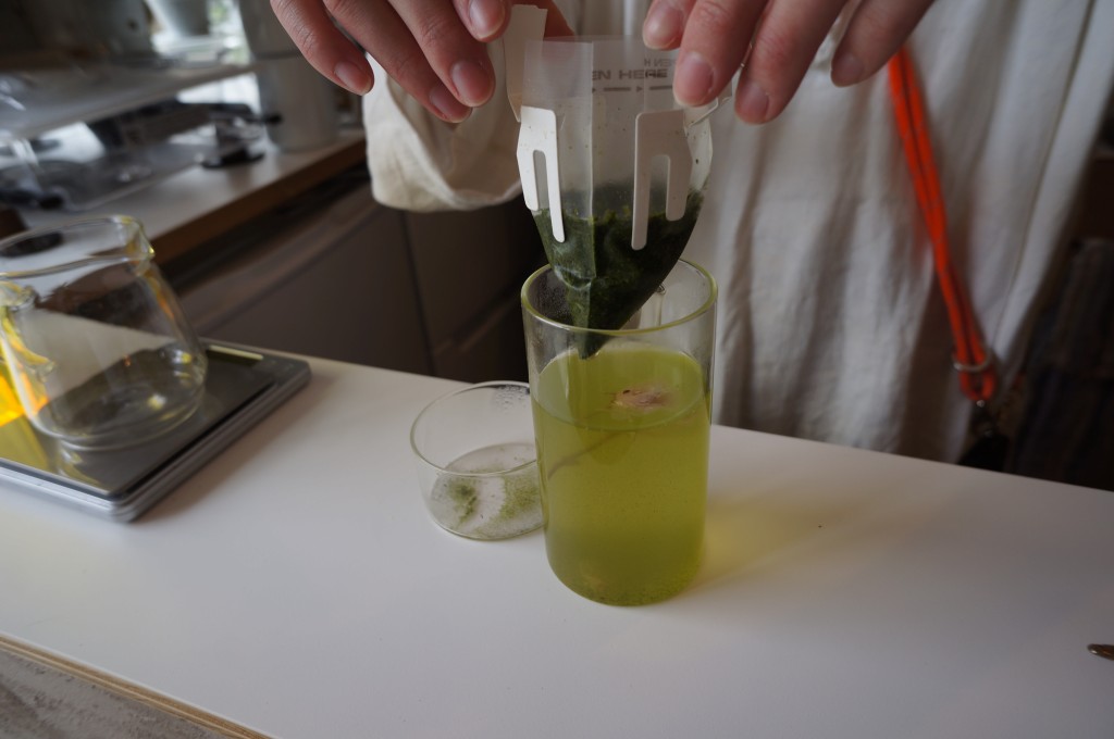 ドリップで丁寧に淹れられる知覧茶は、渋みゼロのまろやかさ。