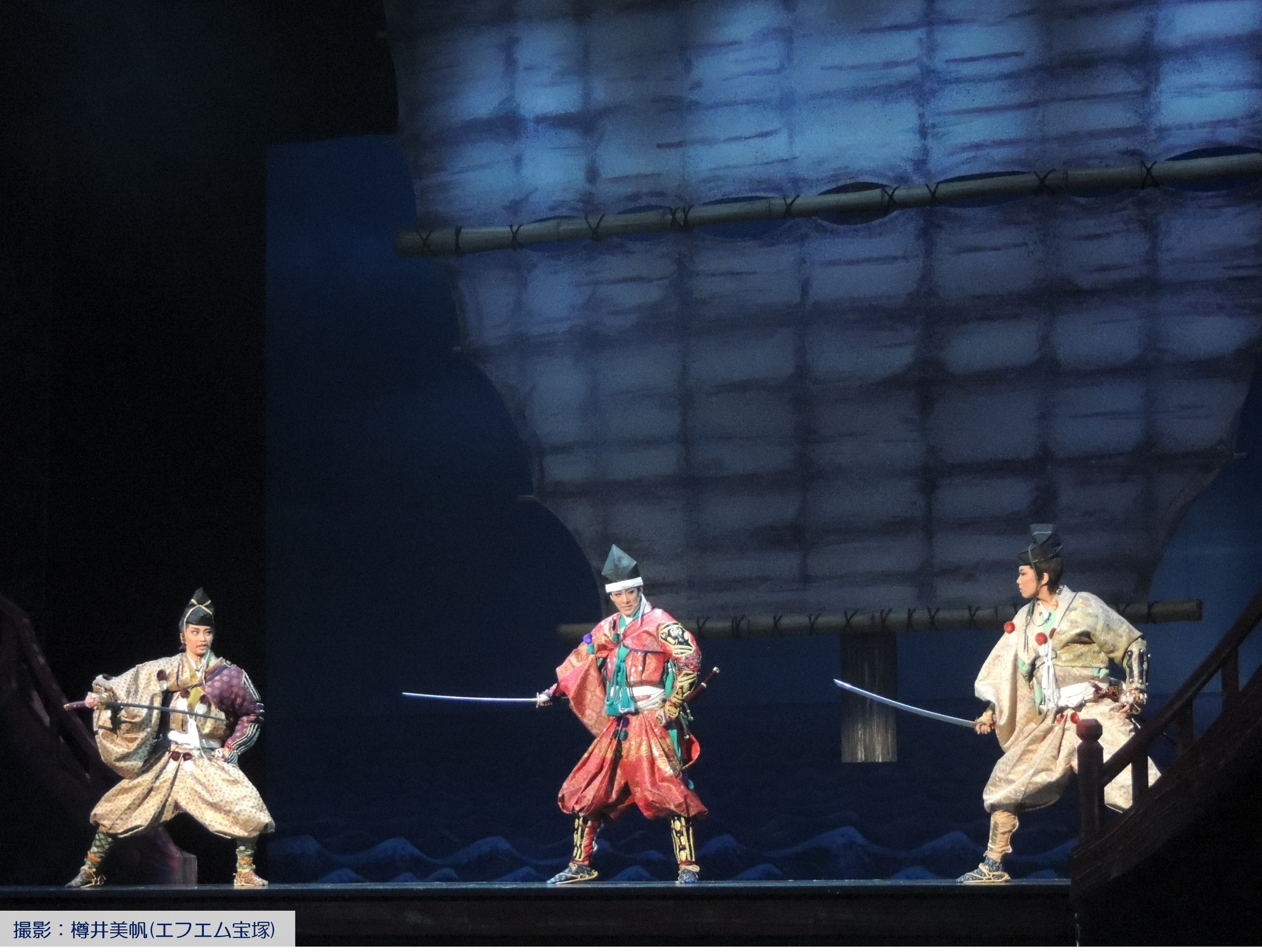大きな船のセットが登場し、勇ましい音楽、眩いライトを浴び、紅色の衣装で登場。
