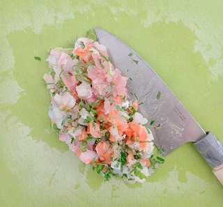 ③細切りにしたアジに大葉・ネギなど薬味と味噌をのせて、包丁でたたきます。