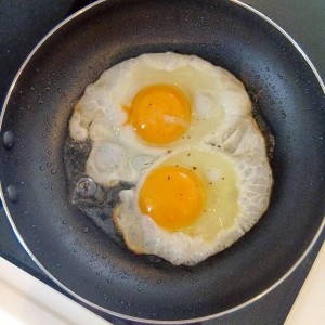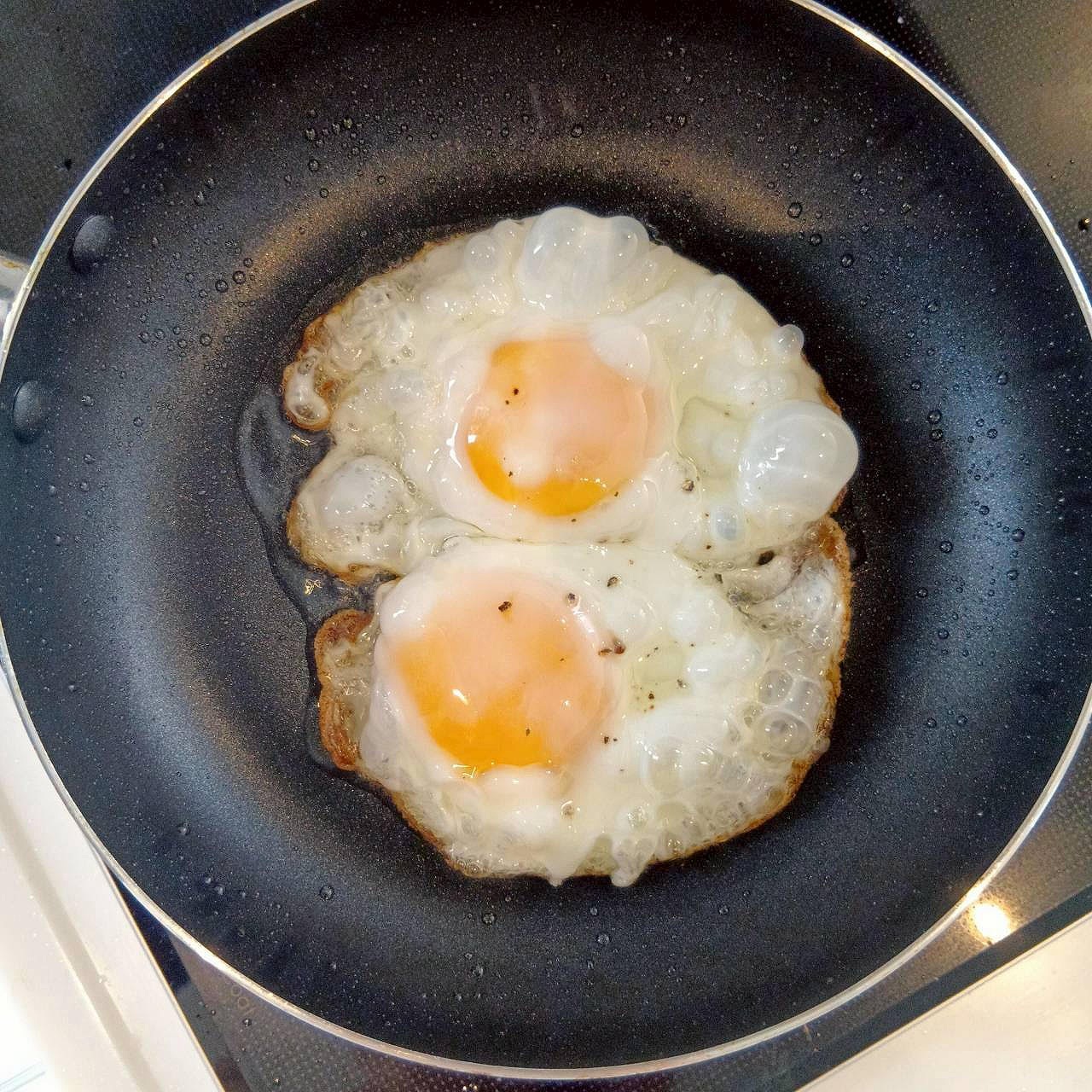 ①まずは目玉焼きを作ります。(多めの油で揚げ焼きにするとパリッと仕上がり美味しいです。