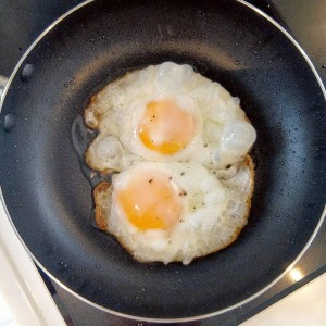 黄身は半熟に仕上げましょう。)目玉焼きに塩コショウをします。