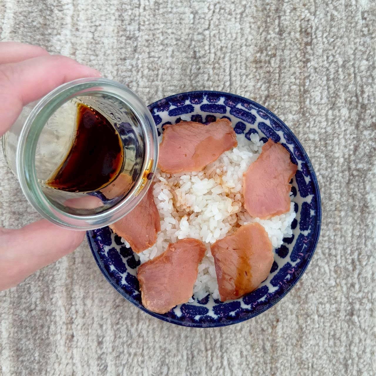 ②目玉焼きを作っている時に、ご飯の上にお好みの量の焼豚をのせます。