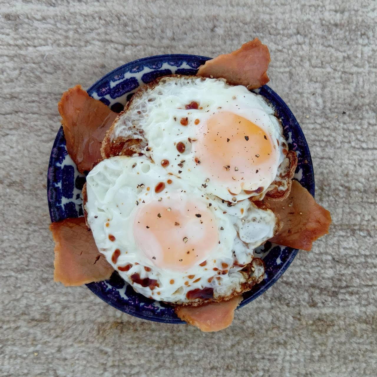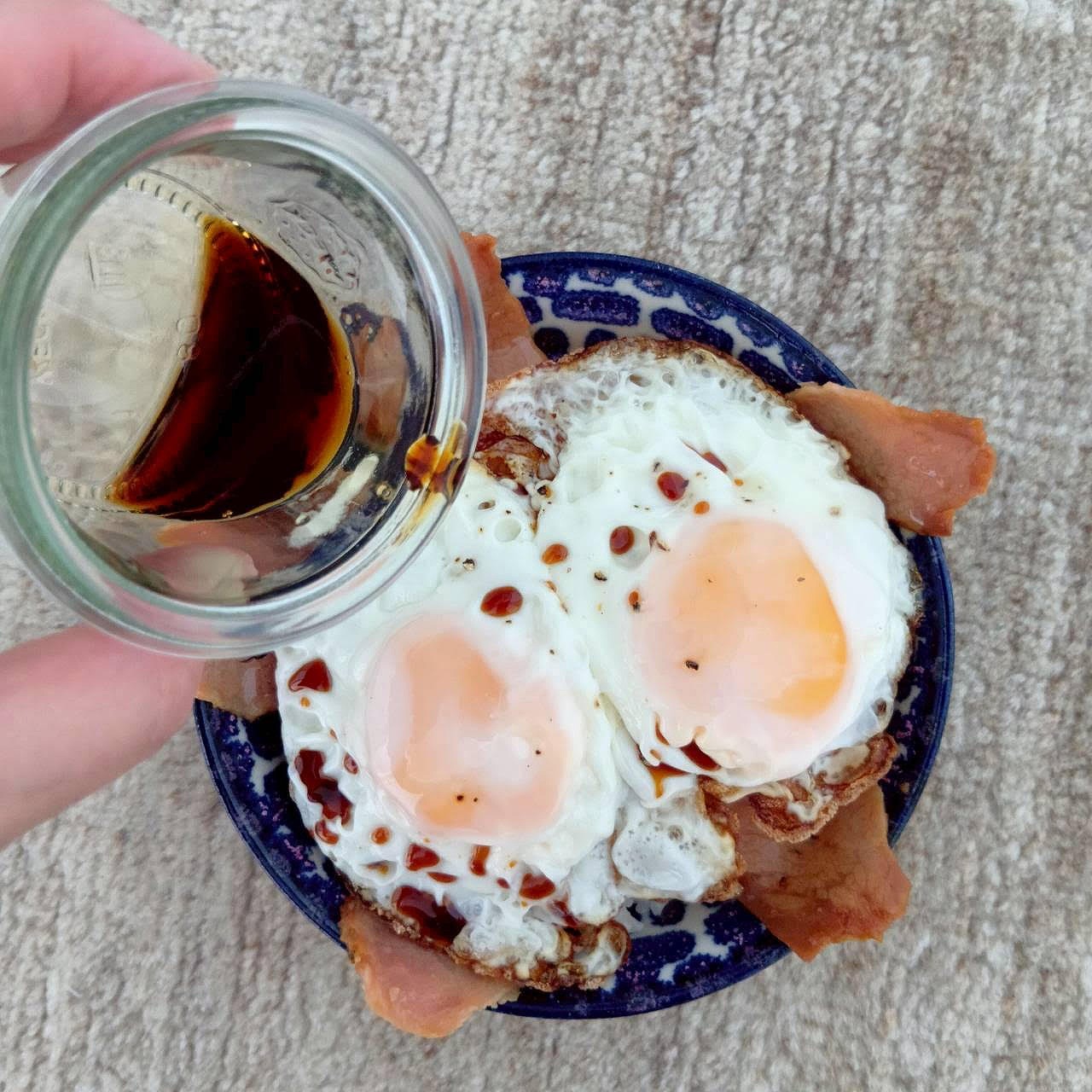 ④焼きたての目玉焼きを焼豚の上に盛って、仕上げにたれをかけます。