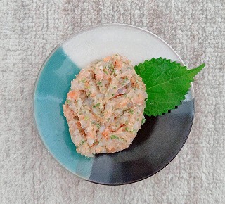 たたいては混ぜをくりかえし、ねばりがでたら大葉を敷いたお皿に盛り付けて完成!!