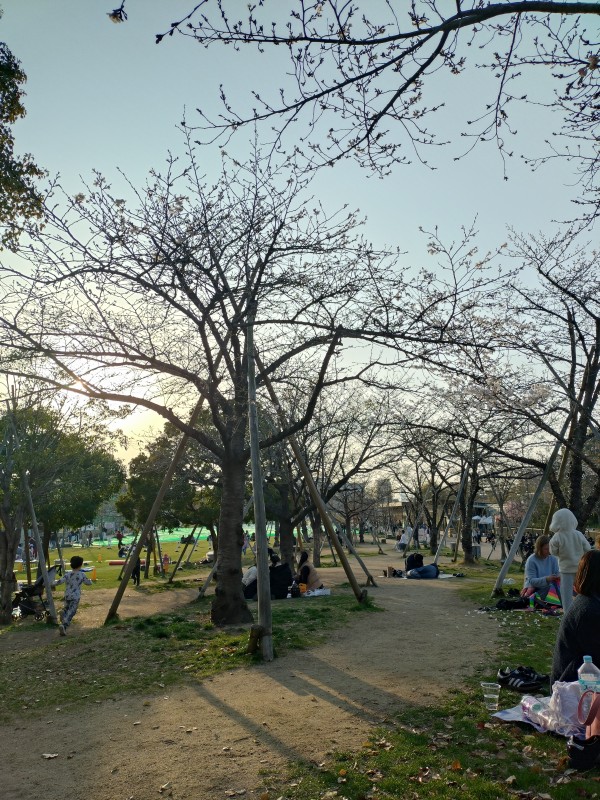 友人とふたりで、大阪天王寺のてんしばで夕暮れお花見デート。